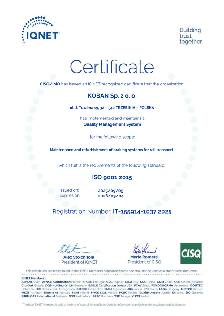 Die hohe Qualität unserer Dienstleistungen zur Regenerierung pneumatischer Bahnbremskomponenten wird unter anderem bestätigt durch erhielt das PKP Intercity Konformitätsbescheinigung und den Status eines anerkannten Lieferanten fur PESA Bydgoszcz S.A.