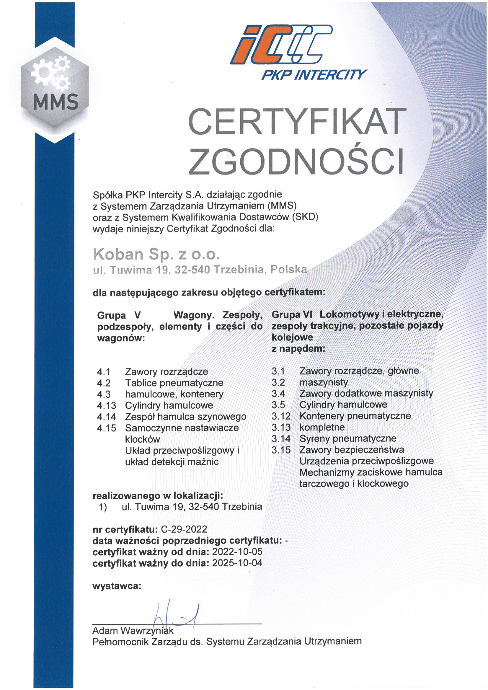 Die hohe Qualität unserer Dienstleistungen zur Regenerierung pneumatischer Bahnbremskomponenten wird unter anderem bestätigt durch erhielt das PKP Intercity Konformitätsbescheinigung und den Status eines anerkannten Lieferanten fur PESA Bydgoszcz S.A.
